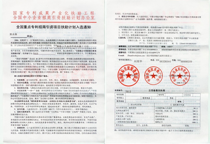 全国重点专利招商引资项目扶助计划入选通知